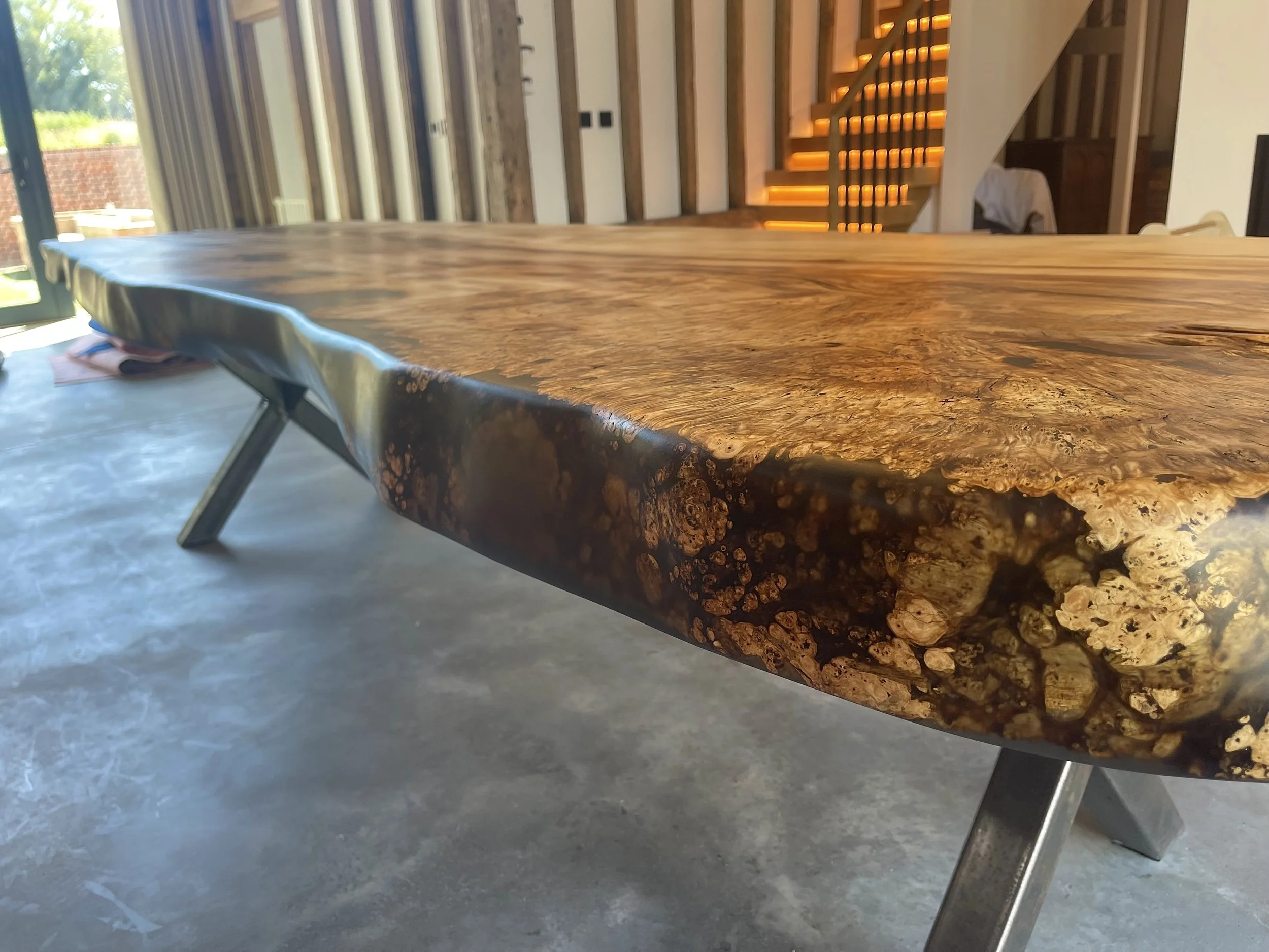 We take you on a journey—from fallen trees in southwest England, through patient drying and hand-shaping—until your table gleams in the dining room, warm and perfect. You pick the details. We do the rest.