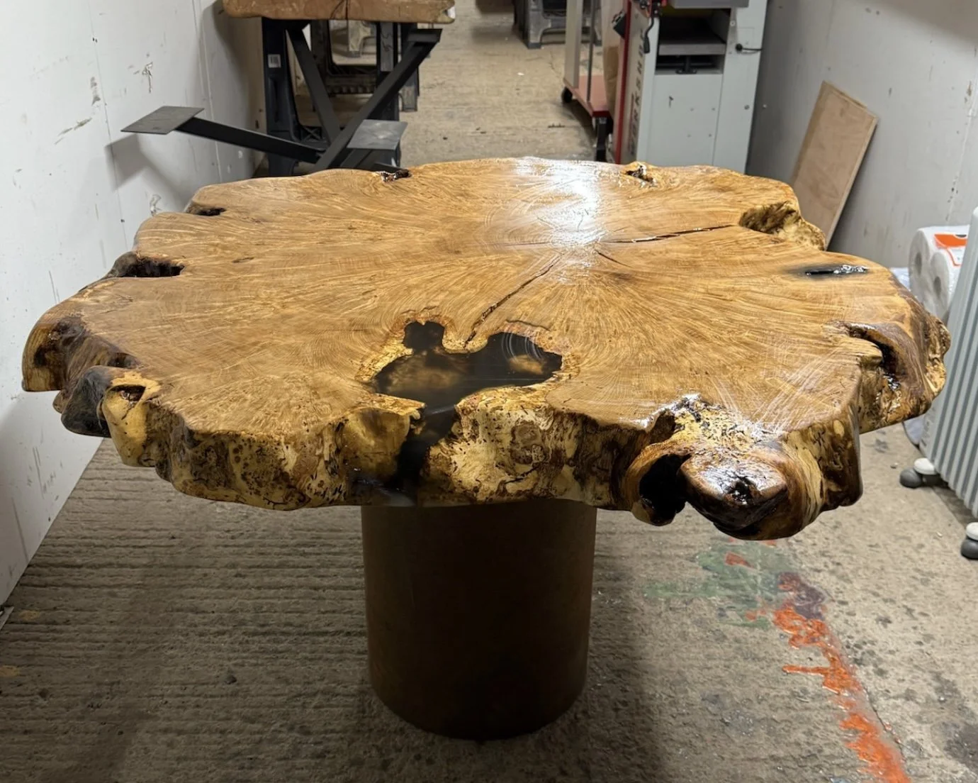The live-edge slab retains its raw, organic contours and bark remnants, creating a striking contrast against the smooth, glossy resin pours. Mounted on a simple, robust metal cylinder base, the piece commands attention in any reception setting. We crafted custom brackets to ensure secure transport and display stability.