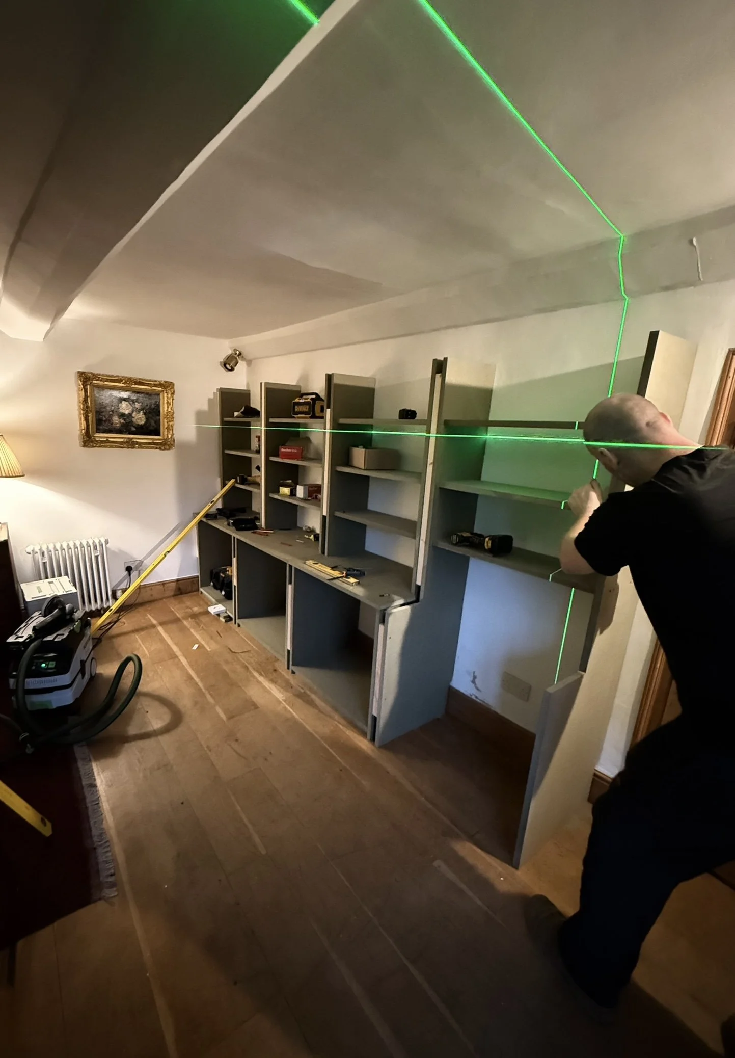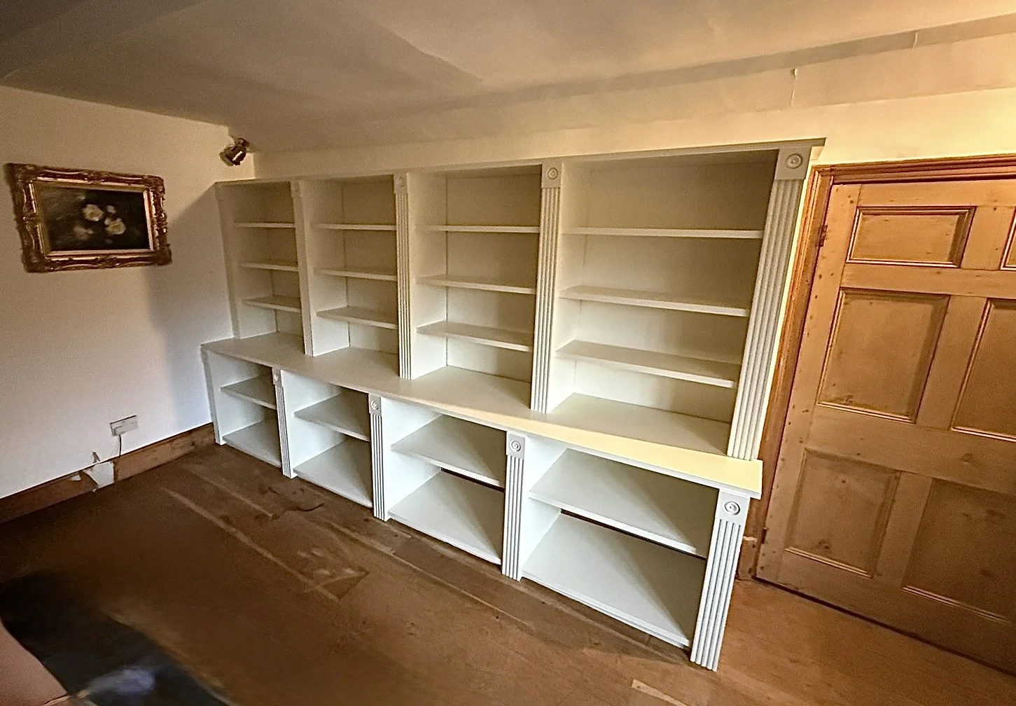 Custom-built Georgian-style bookcase masterpiece fills the attic room wall. Fluted pilasters with rosettes, deep white-painted shelves, generous proportions. Designed to house 1000 books comfortably—perfect for a serious library collection.
