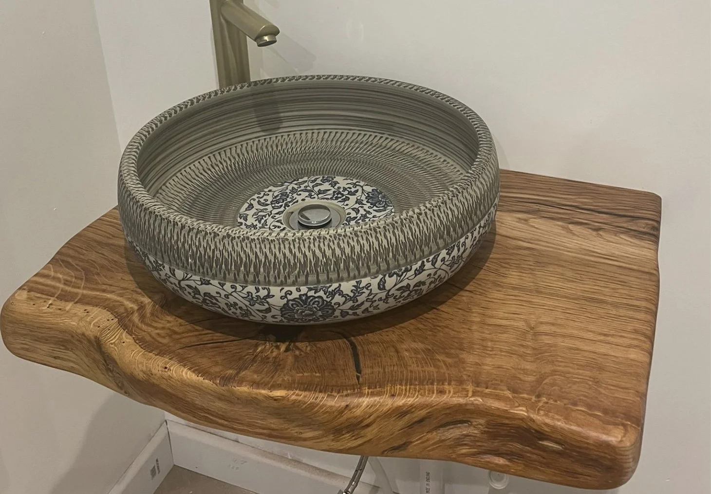Mounted in a compact corner space, the setup achieves an organic yet refined aesthetic: the raw, sculpted timber edge softly cantilevers from the wall, exposing live knots and cracks filled with glossy black resin, while the minimalist brushed-bronze faucet rises cleanly above, allowing the interplay of rustic wood, modern concrete, and delicate chinoiserie detailing to remain the focal point.