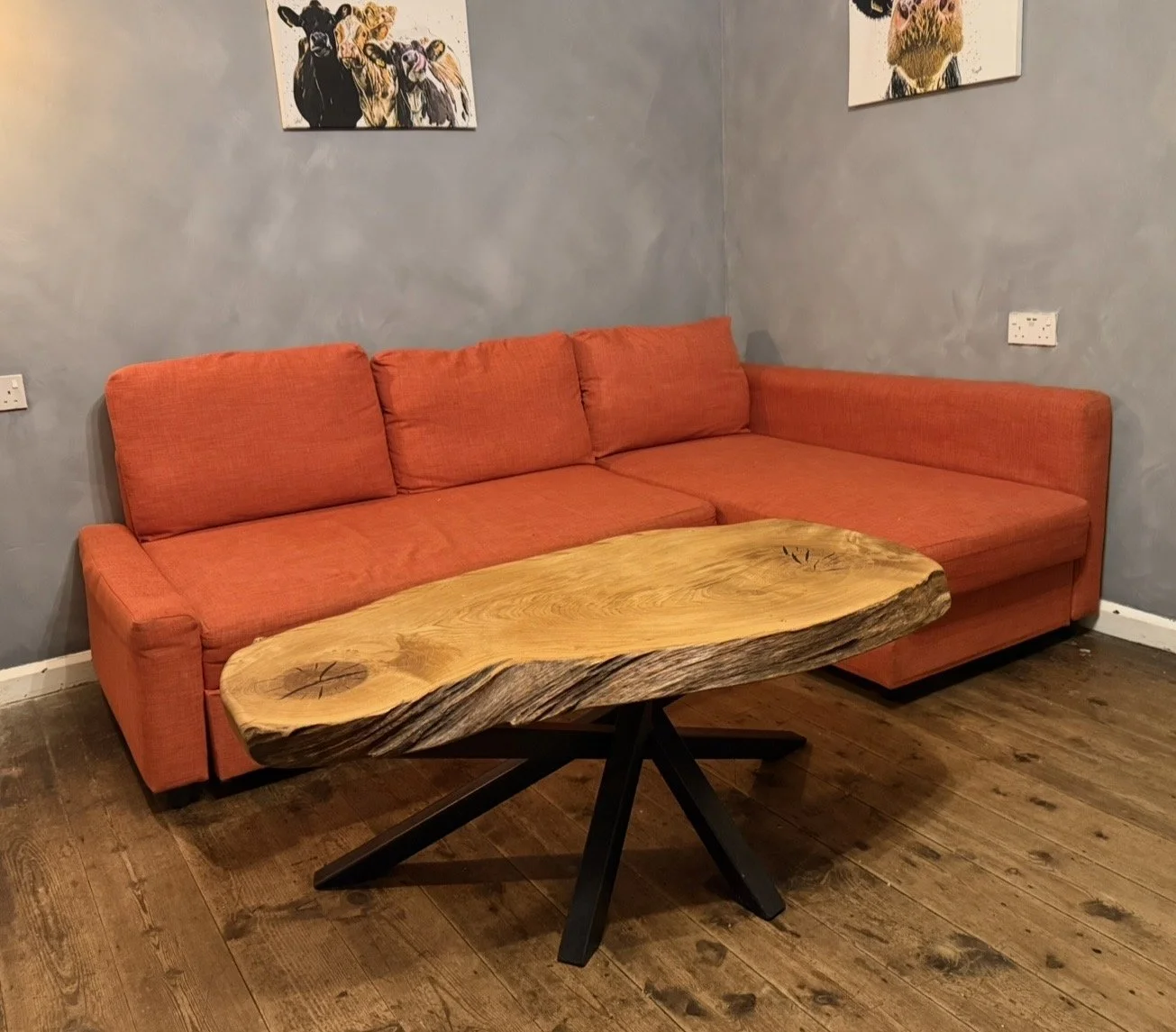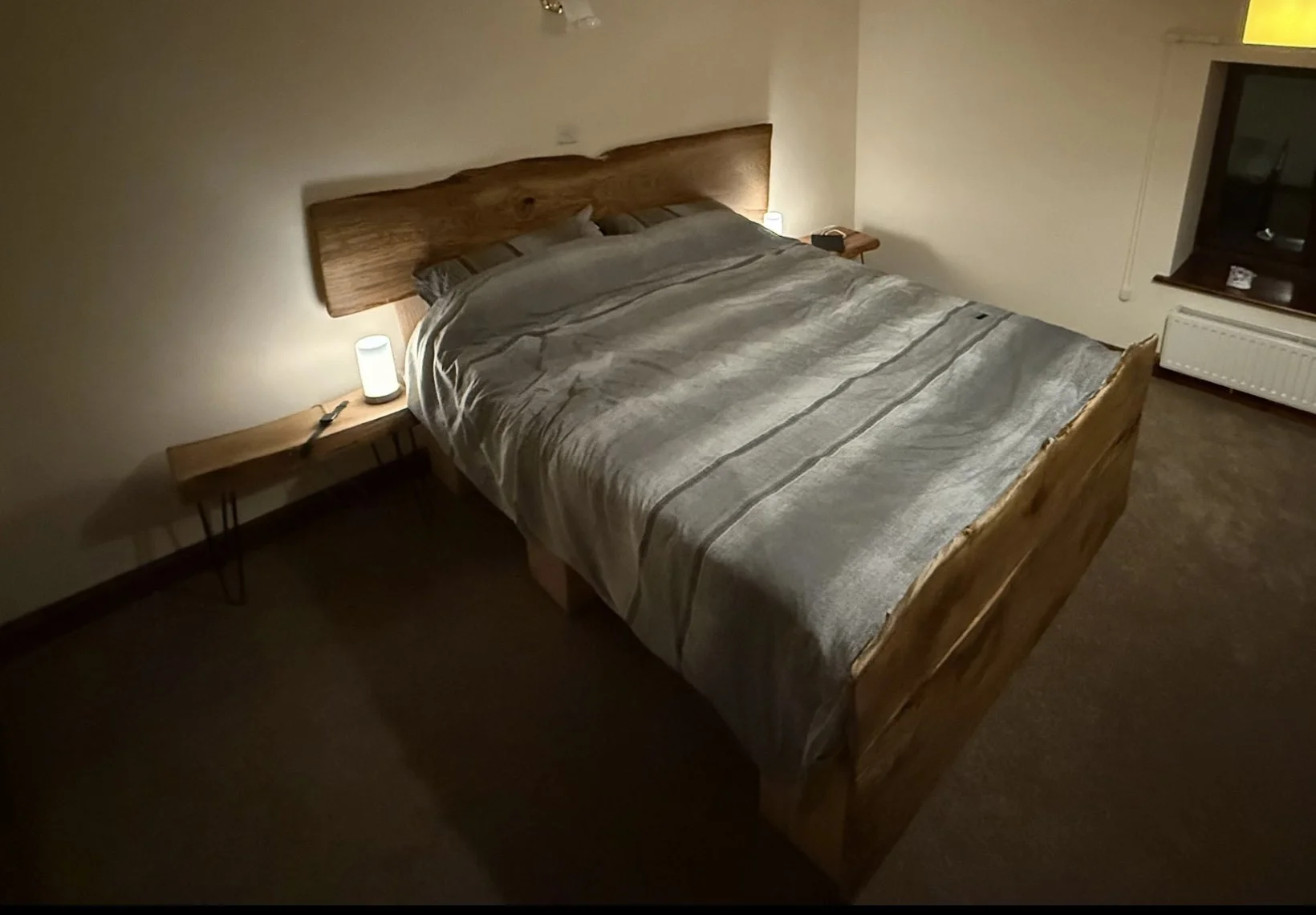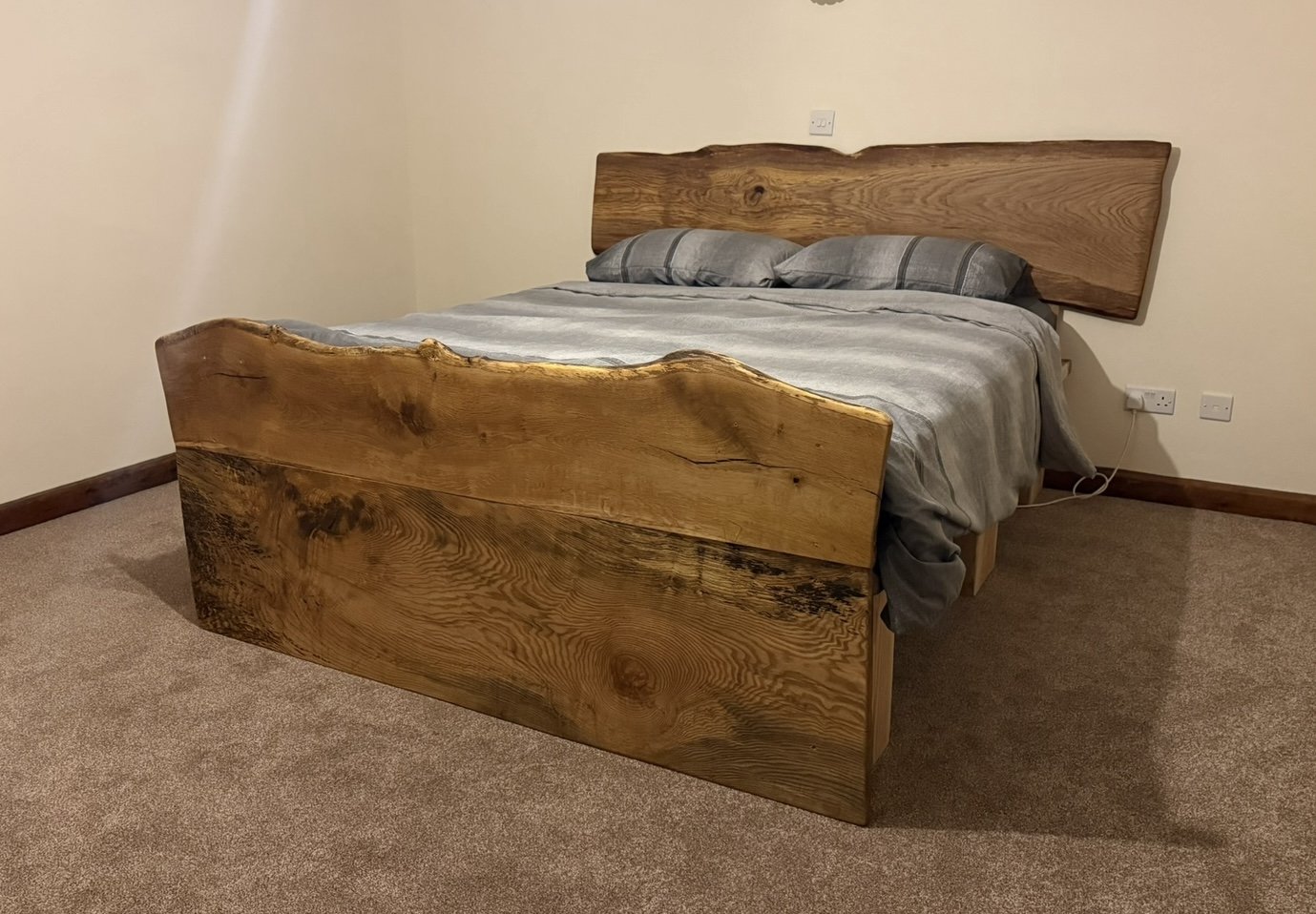 This stunning bedroom project centers on a live-edge oak bed crafted from 200-year-old Dartmoor oak felled naturally, its rugged, irregular edges and rich golden grain preserved across headboard, footboard, and frame.