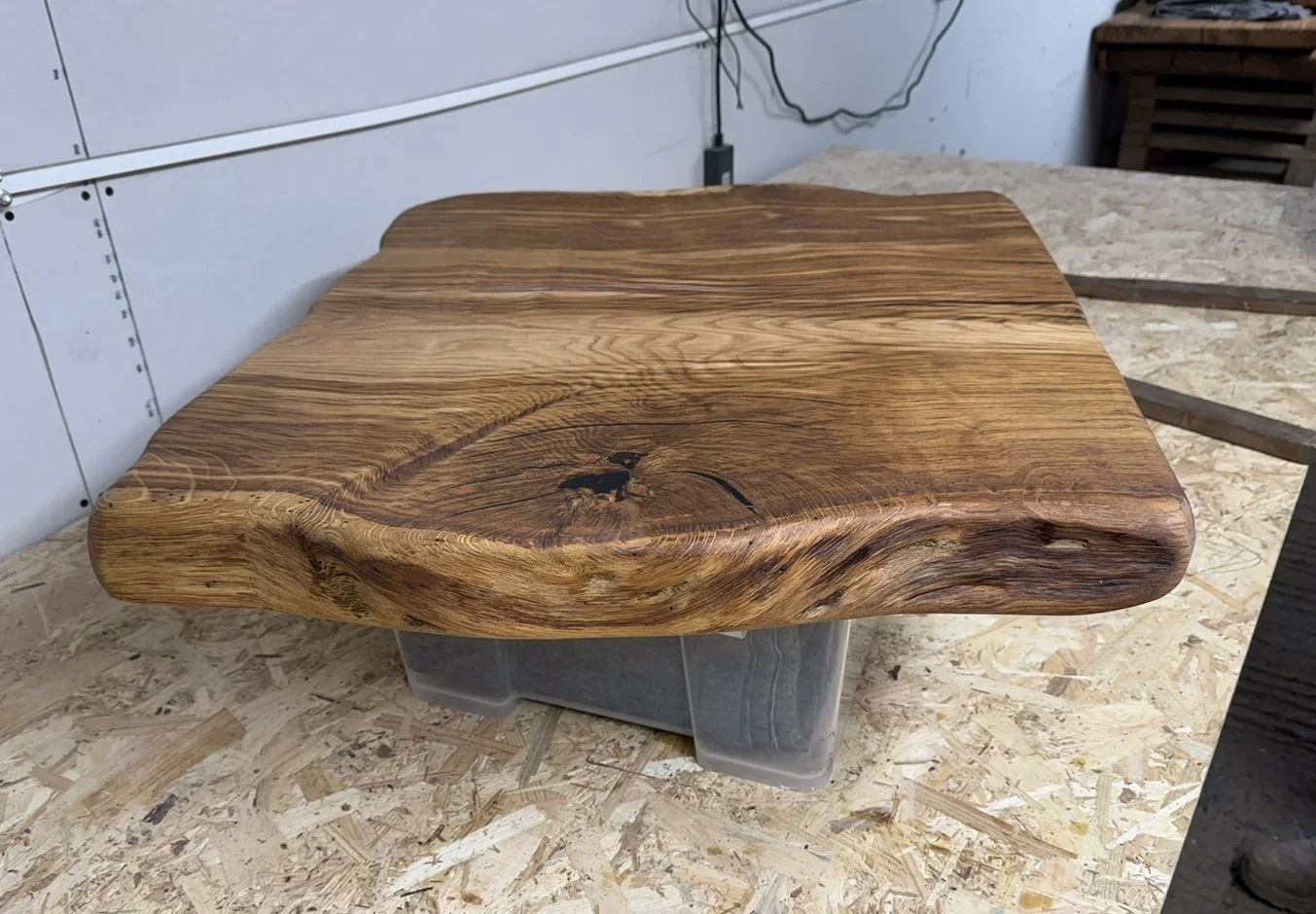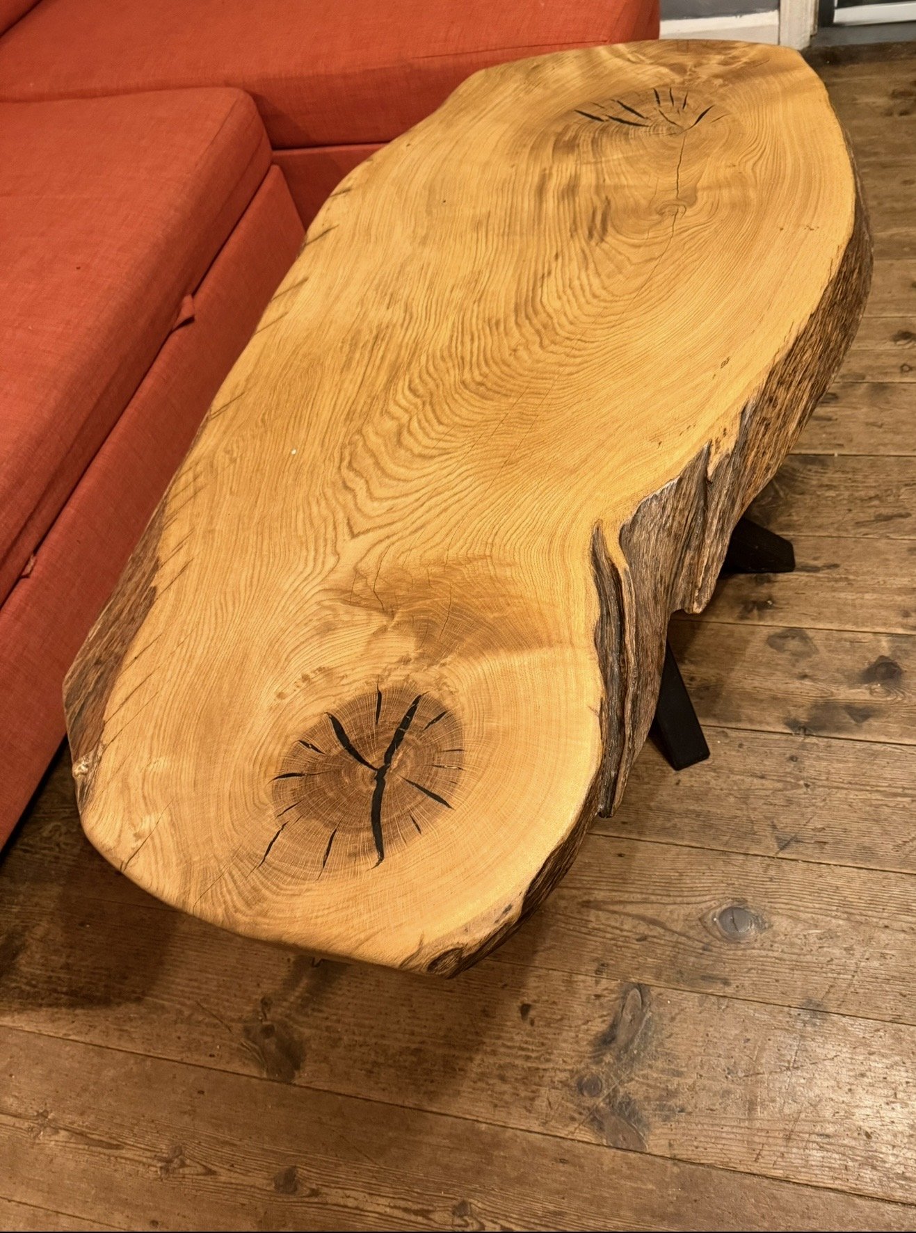 This oak slab coffee table is a standout: 75% live edge preserved—true holy grail status for natural beauty and character. Deep black resin fills the voids and cracks, creating bold, high-contrast rivers against the warm golden wood.