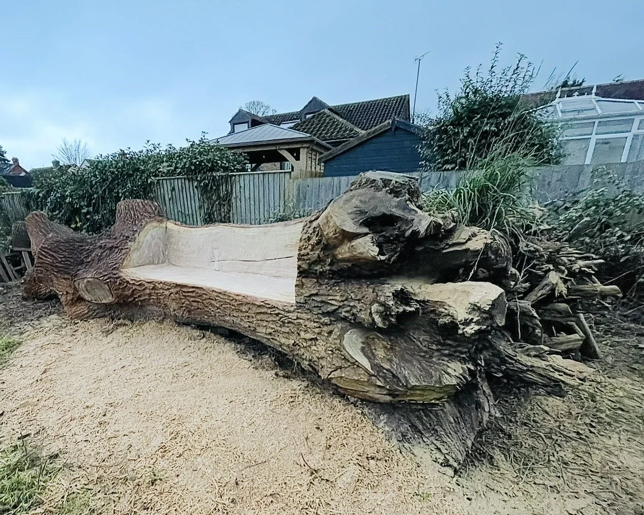 Fallen giant oak, chainsaw-sculpted into a massive outdoor bench straight from the trunk. Bark left wild and textured, seat hollowed deep for comfort, raw rugged form preserved—huge scale, brutal organic power, perfect for epic garden presence