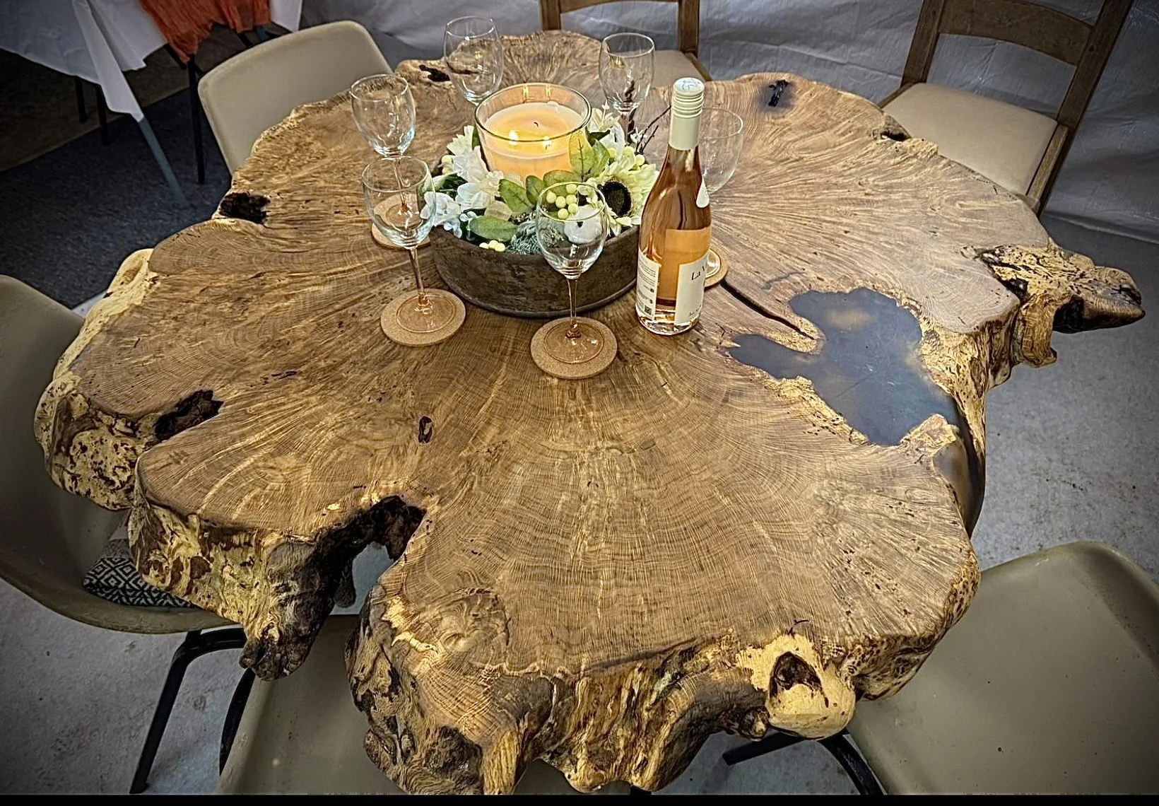 This custom wedding centrepiece is a massive, irregularly shaped oak slice tabletop featuring rich golden-brown grain and natural cracks filled with semi-opaque grey resin that mimics flowing rivers.