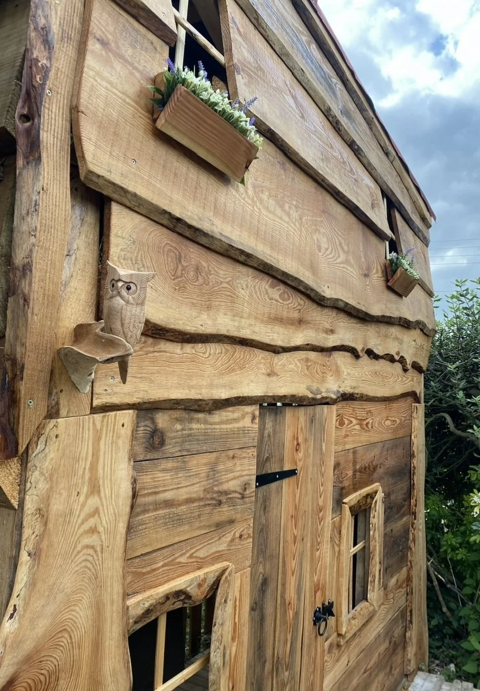 Hand-built larch playhouse, raw and rugged like a woodland fortress. Weathered timber walls with wavy bark edges, tiny crooked windows blooming with flowers, heavy black iron hinges on double doors. Epic mini cabin vibe, pure backyard adventure.